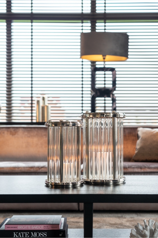 Światło od palącej się świeczki delikatnie przenika przez przezroczyste szkło, tworząc nastrojowe oświetlenie.