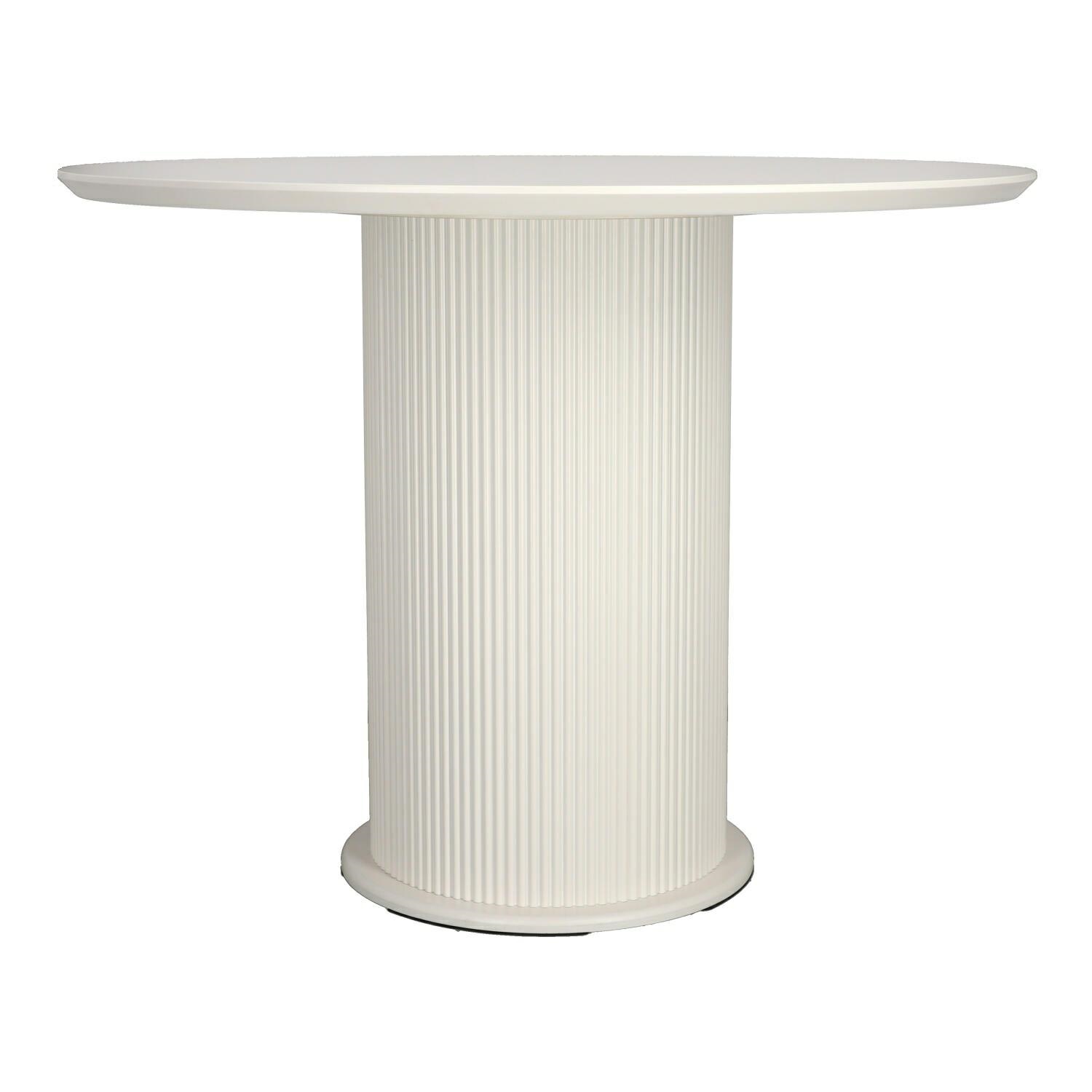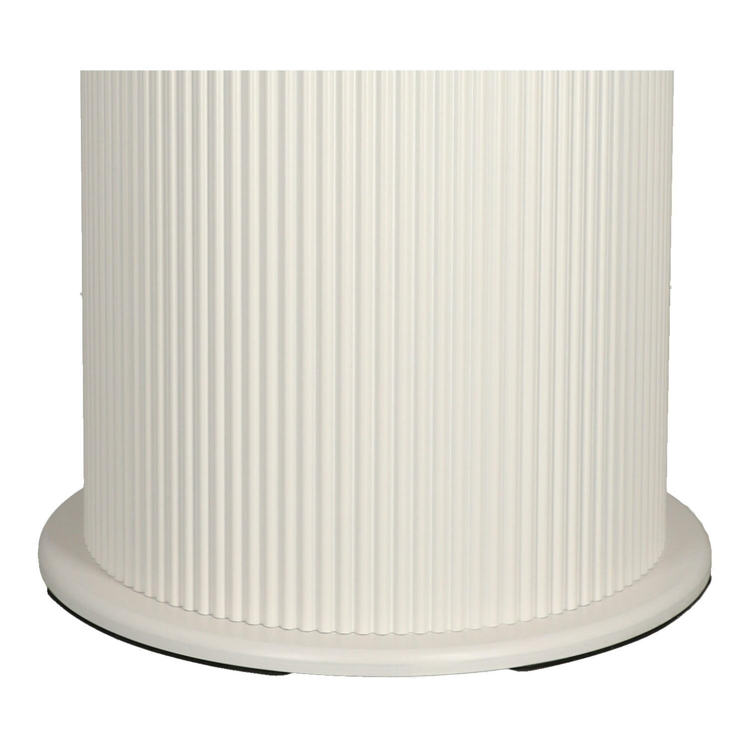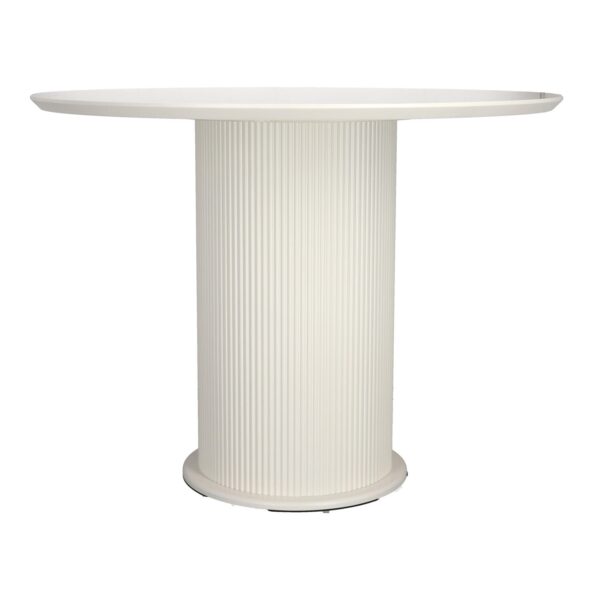 Okrągły biały stół z pojedynczą nogą ozdobioną lamelami sprawdzi się nie tylko we wnętrzu boho, czy skandynawskim, ale również w nowoczesnej jasne przestrzeni. Stół o średnicy 100 cm wykonany został z połączenia melaminy oraz płyty MDF. Melamina użyta na blacie stołu jest bardzo trwała, trudno palna i przede wszystkim odporna na działanie wody, wysokich temperatur i światła. Podstawa natomiast to frezowana płyta MDF. Cały mebel został polakierowany na biało, co sprawia, że jest on delikatni i z pewnością nie przytłoczy wnętrza. Pakowany w 2 kartony (108x108x8cm 18kg i 52x52x78cm 16kg)