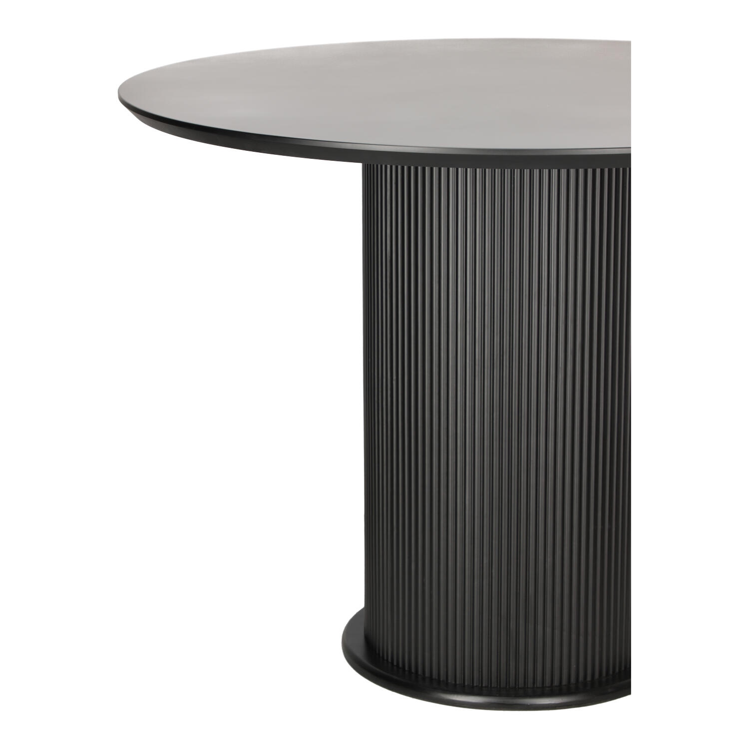Okrągły czarny stół z pojedynczą nogą ozdobioną lamelami sprawdzi się nie tylko we wnętrzu boho, czy skandynawskim, ale również w nowoczesnej jasne przestrzeni. Stół o średnicy 100 cm wykonany został z połączenia melaminy oraz płyty MDF. Melamina użyta na blacie stołu jest bardzo trwała, trudno palna i przede wszystkim odporna na działanie wody, wysokich temperatur i światła. Podstawa natomiast to frezowana płyta MDF. Cały mebel został polakierowany na czarno, co sprawia, że jest on delikatni i z pewnością nie przytłoczy wnętrza. Pakowany w 2 kartony (108x108x8cm i 52x52x78cm)