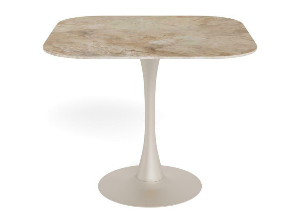 Ten kwadratowy stół jadalny z zaokrąglonymi narożnikami podtrzyma rozmowę. Dzięki okrągłej podstawie, brązowo-szary stół ma lekki i unoszący się w powietrzu wygląd. Ale to nie tylko styl – ceramiczny blat jest również praktyczny. Ceramika to materiał odporny na ciepło i zarysowania, wymagający niewielkiej konserwacji. Oszałamiający i praktyczny – dokładnie taki, jaki być powinien.