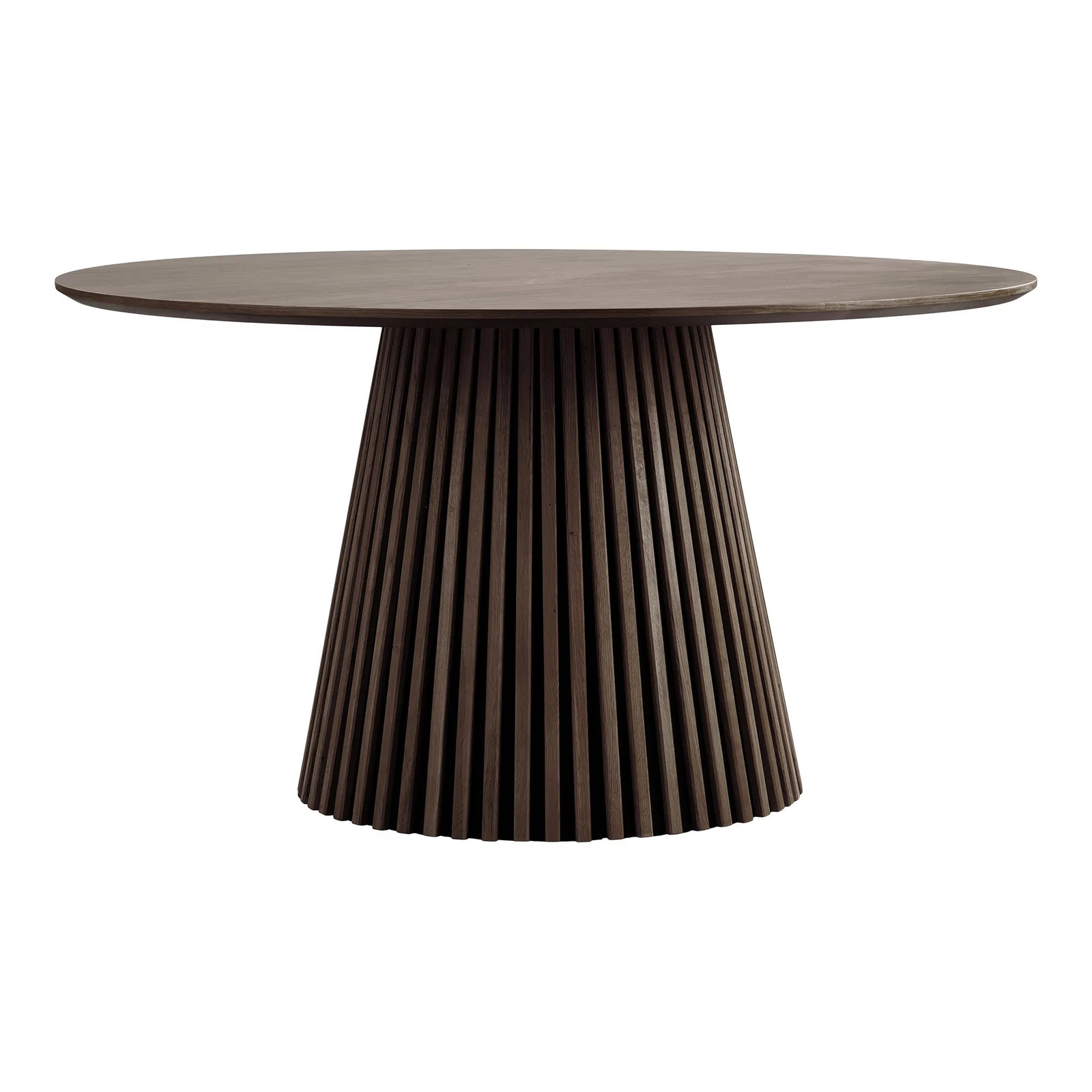 Stół na jednej nodze wykończnej drewnianymi lamelami.