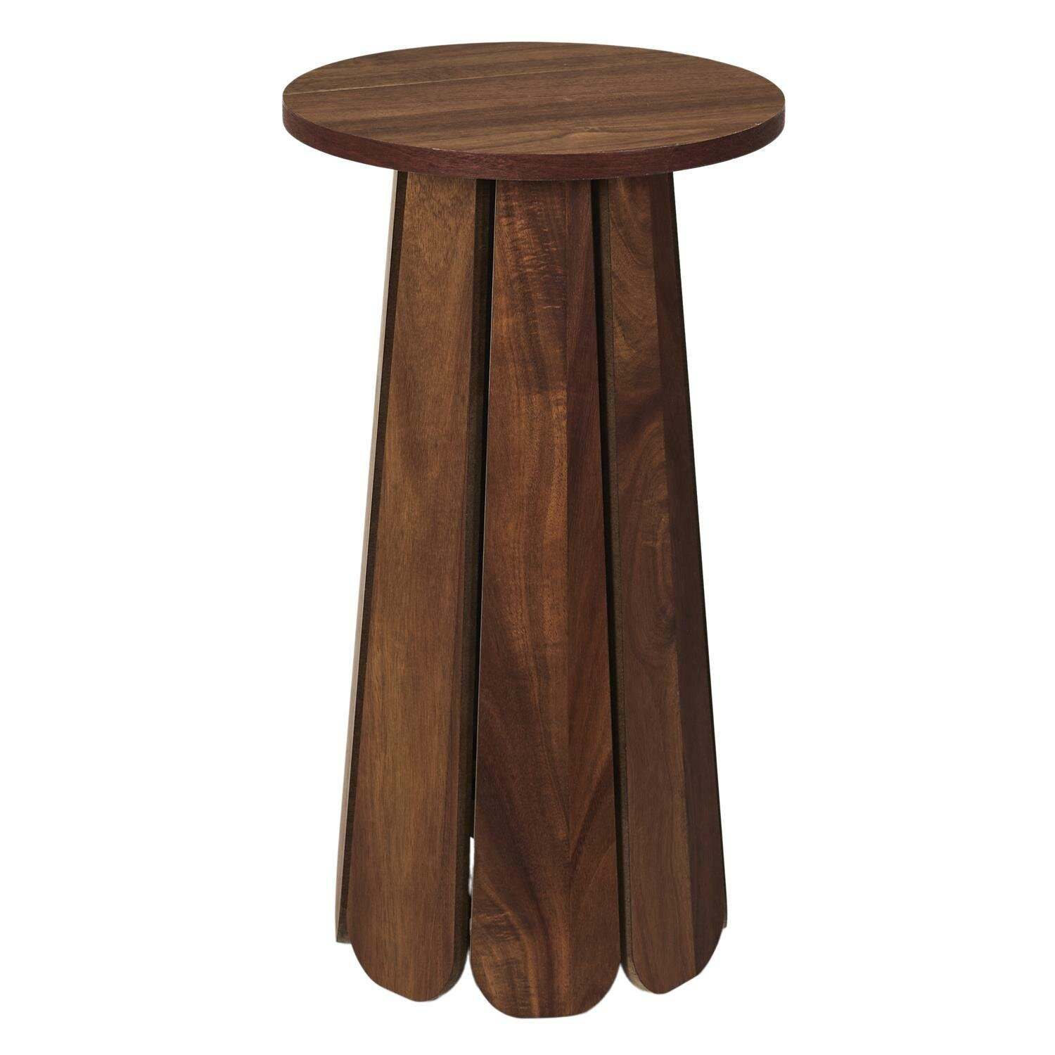 Stolik boczny Will wykonany został z płyty MDF w okleinie w kolorze drewna orzecha. Stolik z okrągłym blatem wyposażony został w pojedynczą nogę, która składa się z 8 deseczek idealnie wyprofilowanych. Stolik wymaga montażu. Max. obciążenie stolika 15kg