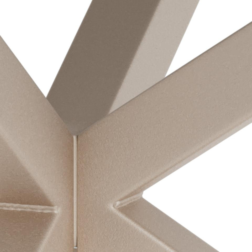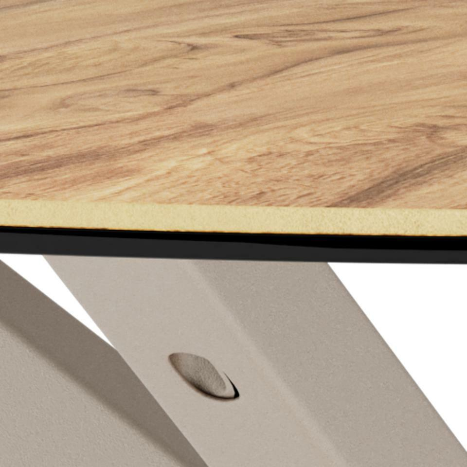 Okrągły stolik kawowy Heaven, blat ze szkła z laminatem w kolorze dzikiego dębu, 4-ramienna podstawa z szarej, surowej stali malowanej proszkowo.