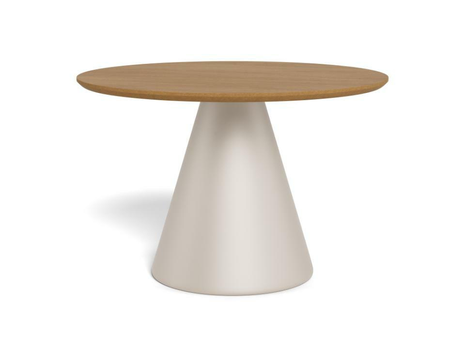 Ten okrągły stolik kawowy, intrygujący wizualnie, subtelnie podkreśli charakter sofy. Projekt łączy w sobie elementy industrialne i naturalne, przywołując poczucie równowagi i harmonii. Stożkowa podstawa w kształcie kolumny, wykonana z szarej stali, w połączeniu z okrągłym blatem wykończonym lakierowanym fornirem dębowym, wydaje się delikatniejsza dla oka.