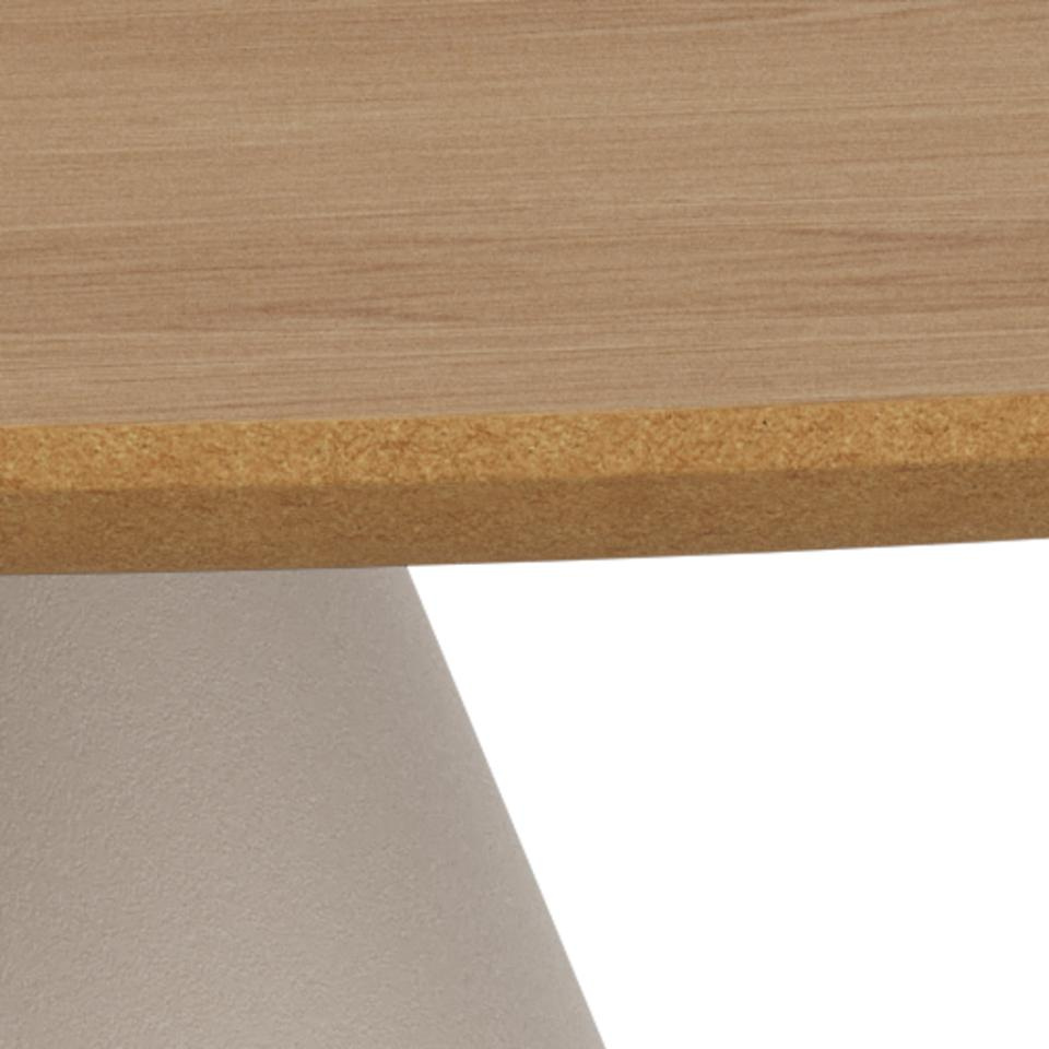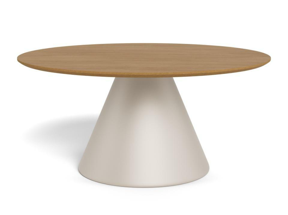 Ten okrągły stolik kawowy, intrygujący wizualnie, subtelnie podkreśli charakter sofy. Projekt łączy w sobie elementy industrialne i naturalne, przywołując poczucie równowagi i harmonii. Stożkowa podstawa w kształcie kolumny, wykonana z szarej stali, w połączeniu z okrągłym blatem wykończonym lakierowanym fornirem dębowym, wydaje się delikatniejsza dla oka.