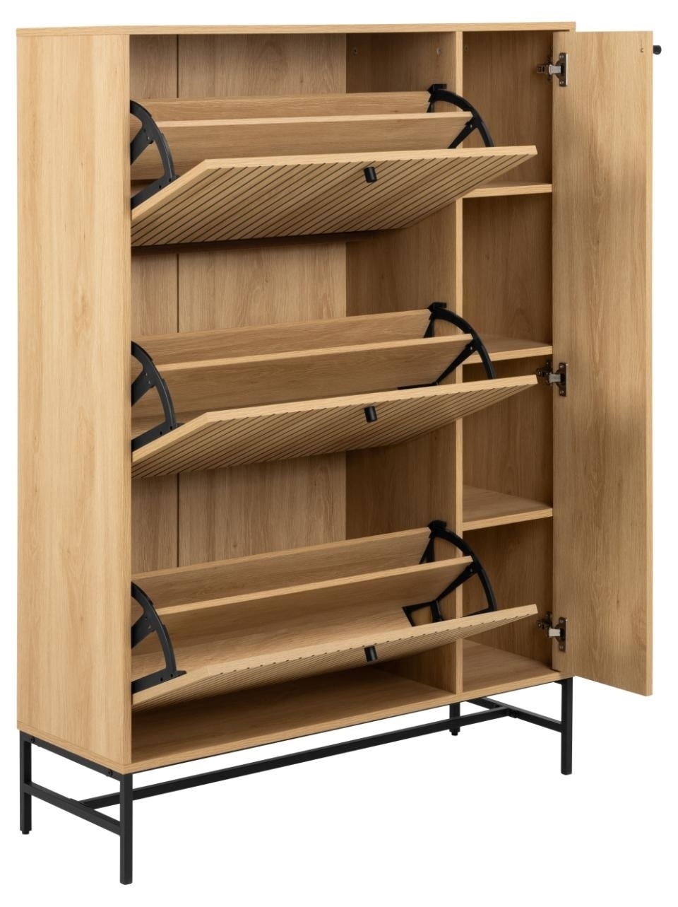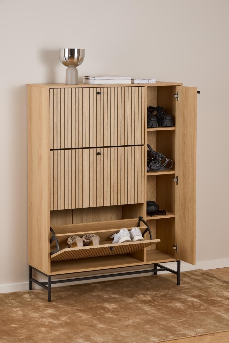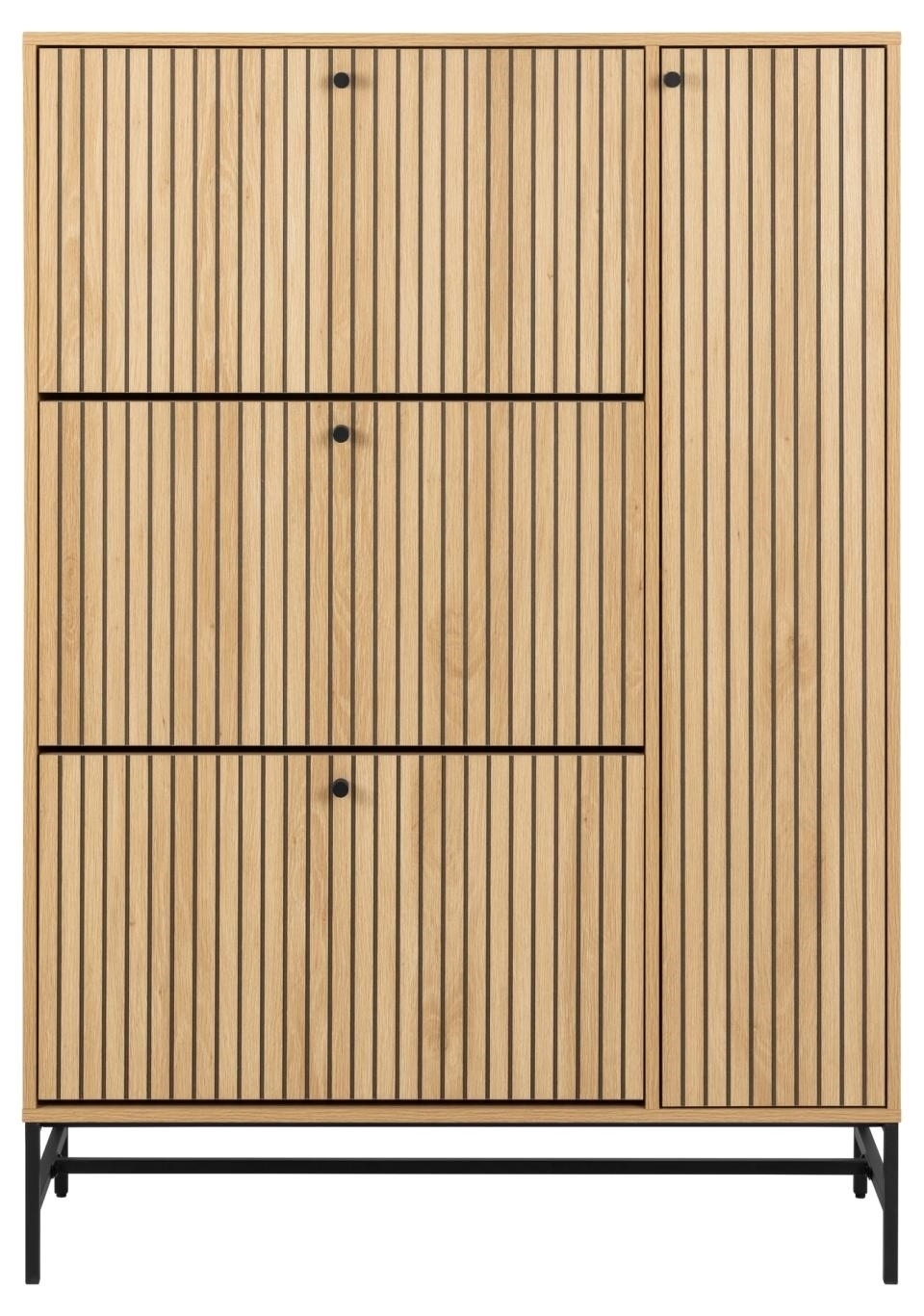 Szafka na buty o wyglądzie naturalnego dębu z lamelowym frontem doda stylu i praktyczności do przedpokoju. Kontrastowy wygląd dębu uzupełniony czarnymi akcentami tworzy dobrze wyważony efekt wizualny. Postaw szafkę w przedpokoju, aby wykorzystać przestrzeń i przechowywać buty poza zasięgiem wzroku. Szafka na buty z frontem lamelowym .. Łatwa w pielęgnacji powierzchnia o wyglądzie dębu . Certyfikat FSC . Zaprojektowany przez projektanta Lasse Cha Pedersena i chroniony wyłącznie dla Actona Wysokośc nóg: 18cm Max. długość buta 35cm Wymaga montażu Wymiary kartonów: 81x69x11cm waga 17kg, 151x59x151, waga 16,7 kg