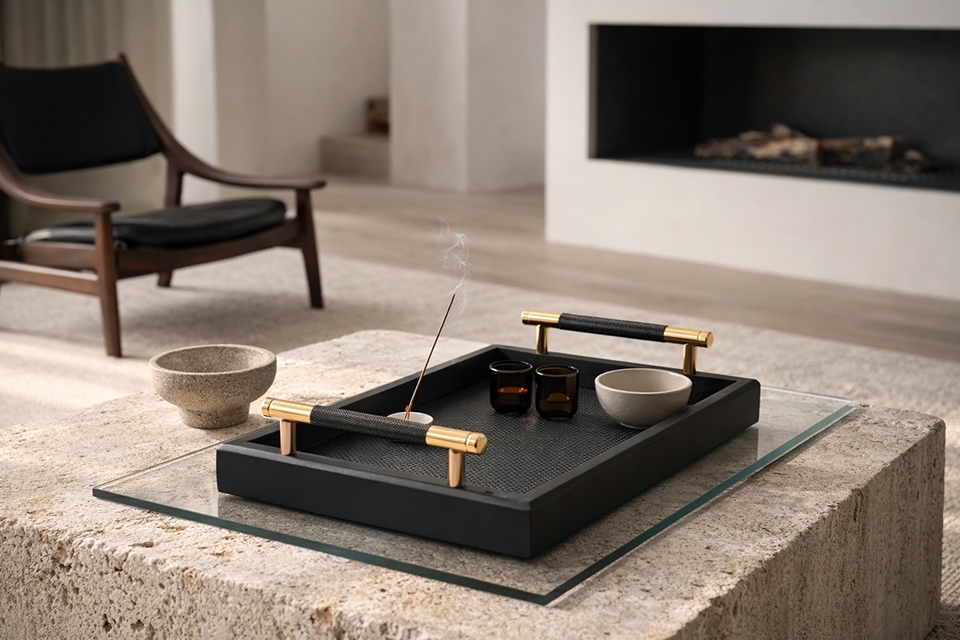 Złote metalowe uchwyty z dekoracyjnym czarnym wykończeniem dodają całości luksusowego akcentu i ułatwiają przenoszenie tacy.