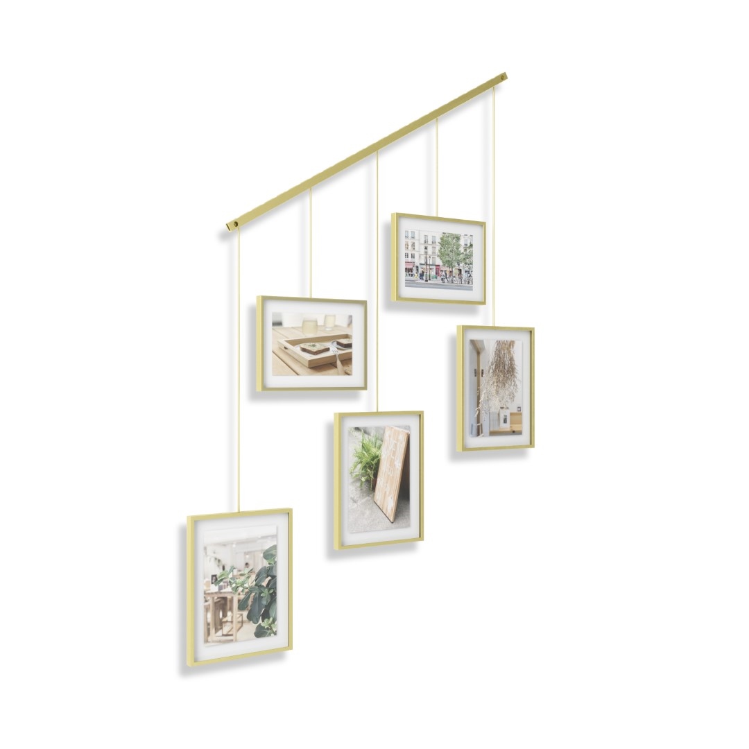 UMBRA ramka na zdjęcia EXHIBIT koloru złotego. Jest to zestaw pięciu ramek, zamocowanych na metalowej półce z klipsami i wspornikami do przechowywania zdjęć o różnych rozmiarach. Wsporniki zamontowane na listwie, która pozwala na dowolną konfigurację ramek ze zdjęciami w celu tworzenia nowych układów. Będzie to świetna dekoracja w salonie, sypialni, przedpokoju czy biurze. Wymiary ramek: Dwie ramki: 10 cm × 15 cm Trzy ramki: 13 cm × 18 cm Waga: 2,5 kg.
