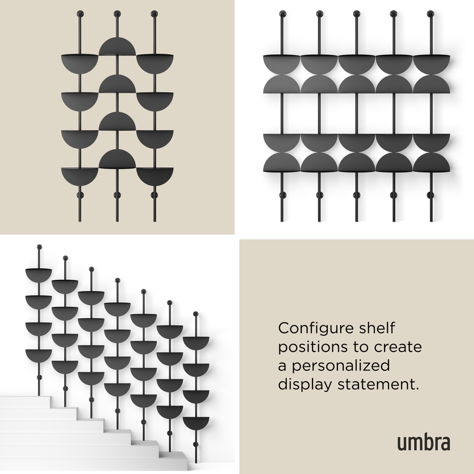 UMBRA regulowane półki ścienne SOLIS czarne. Nowoczesne i eleganckie rozwiązanie do przechowywania i eksponowania przedmiotów, które doskonale wpasuje się w każdą przestrzeń. System składa się z czterech półokrągłych półek wykonanych z wytrzymałej, giętej stali, zamontowanych na smukłym, pionowym słupku. Dzięki możliwości regulacji wysokości oraz orientacji półek (skierowanych w górę lub w dół), użytkownik może dostosować układ do własnych potrzeb. Każda półka wytrzymuje obciążenie do 6,8 kg, co czyni ją praktycznym i funkcjonalnym rozwiązaniem do domu, biura czy przestrzeni komercyjnych. Minimalistyczny design i czarne, matowe wykończenie dodają wnętrzu nowoczesnego charakteru. Połącz kilka modułów, aby stworzyć efektowną, spersonalizowaną ścianę ekspozycyjną. Wymiary: wys. 204 cm / szer. 27 cm / gł. 35 cm Waga: 6,14 kg.
