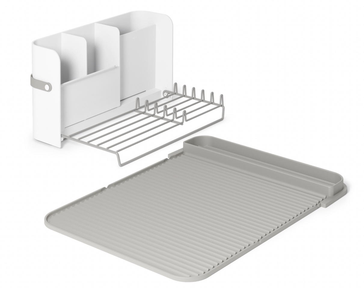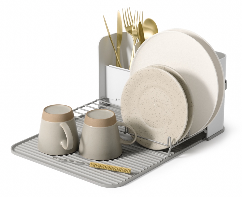 Podstawa ma trzy sekcje: na sztućce, duże przybory kuchenne oraz akcesoria do czyszczenia naczyń, takie jak gąbki i szczotki.