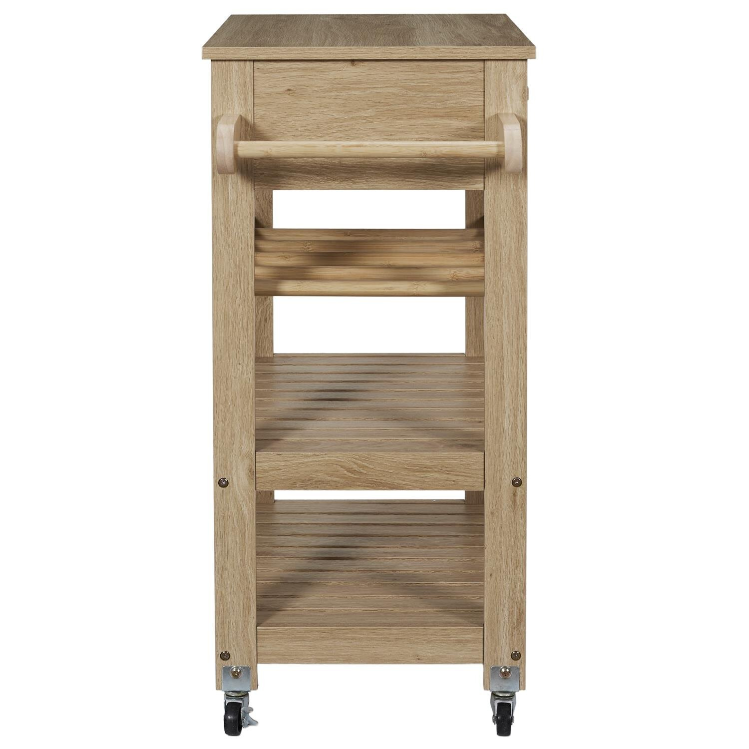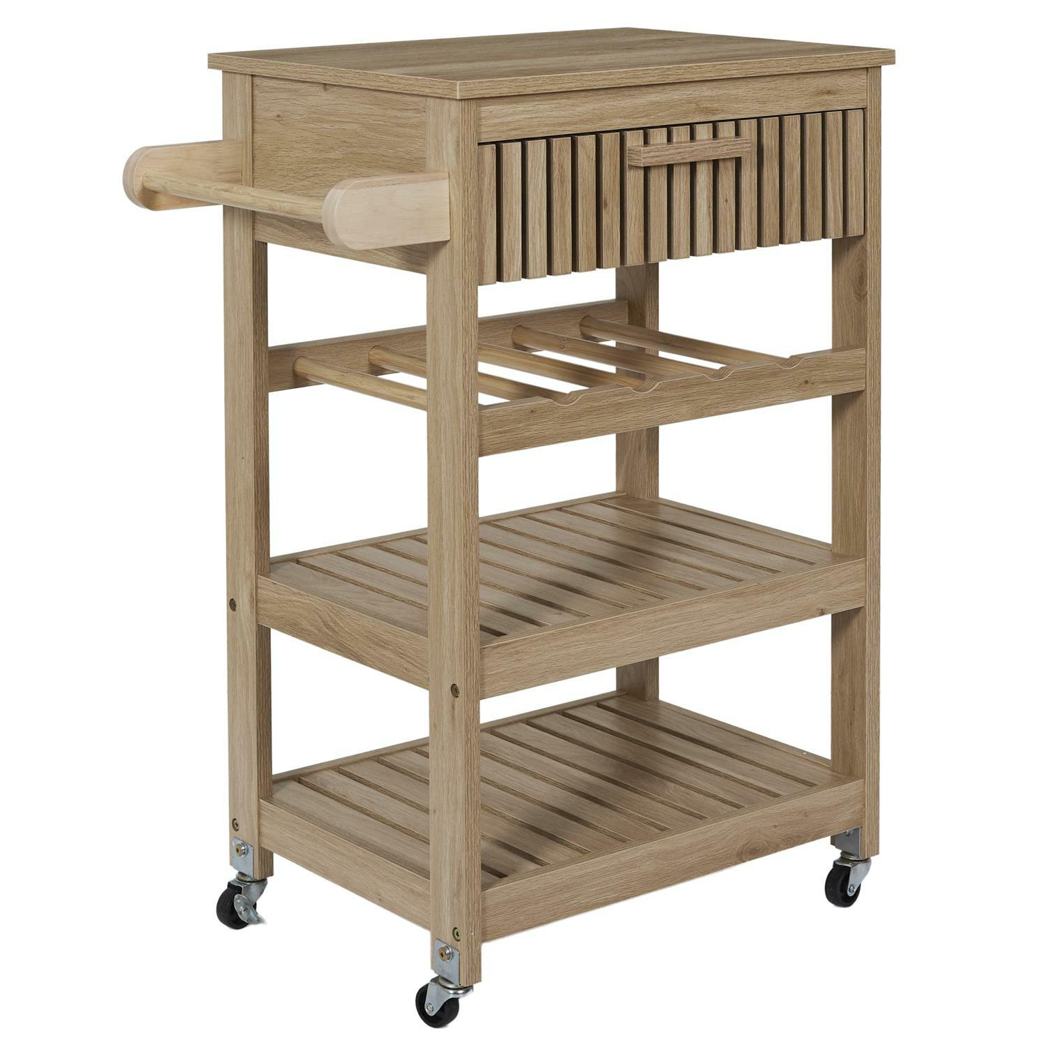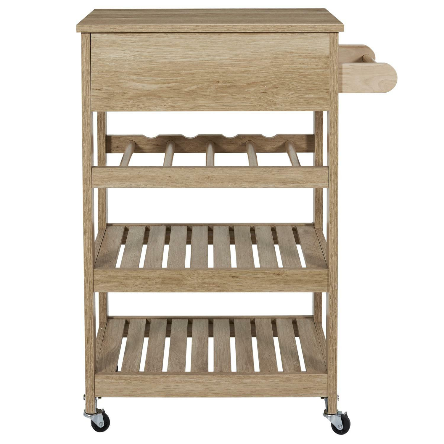 Wózek do serwowania Klaus to idealny przyjaciel każdej uporządkowanej pani domu. Wózek może byc pomocny w przenoszeniu potraw z kuchni do jadalni lub może posłyżyć jako dodtkowy blat i miejsce do przechowywania. Wózek wyposazony został w półkę na butleki wina oraz dwie półki na dowolne przedmioty. Dodatkowo pod blatem ukryta została szuflada z frontem w lamele. Wózek łatwo będzie przesuwać, trzymając za uchwy, który został przymocowany na bocznej ściance wózka. Cztery kółka z tworzywa gwarantuja łatwe przesuwanie wózka i skrę w każdą stronę.