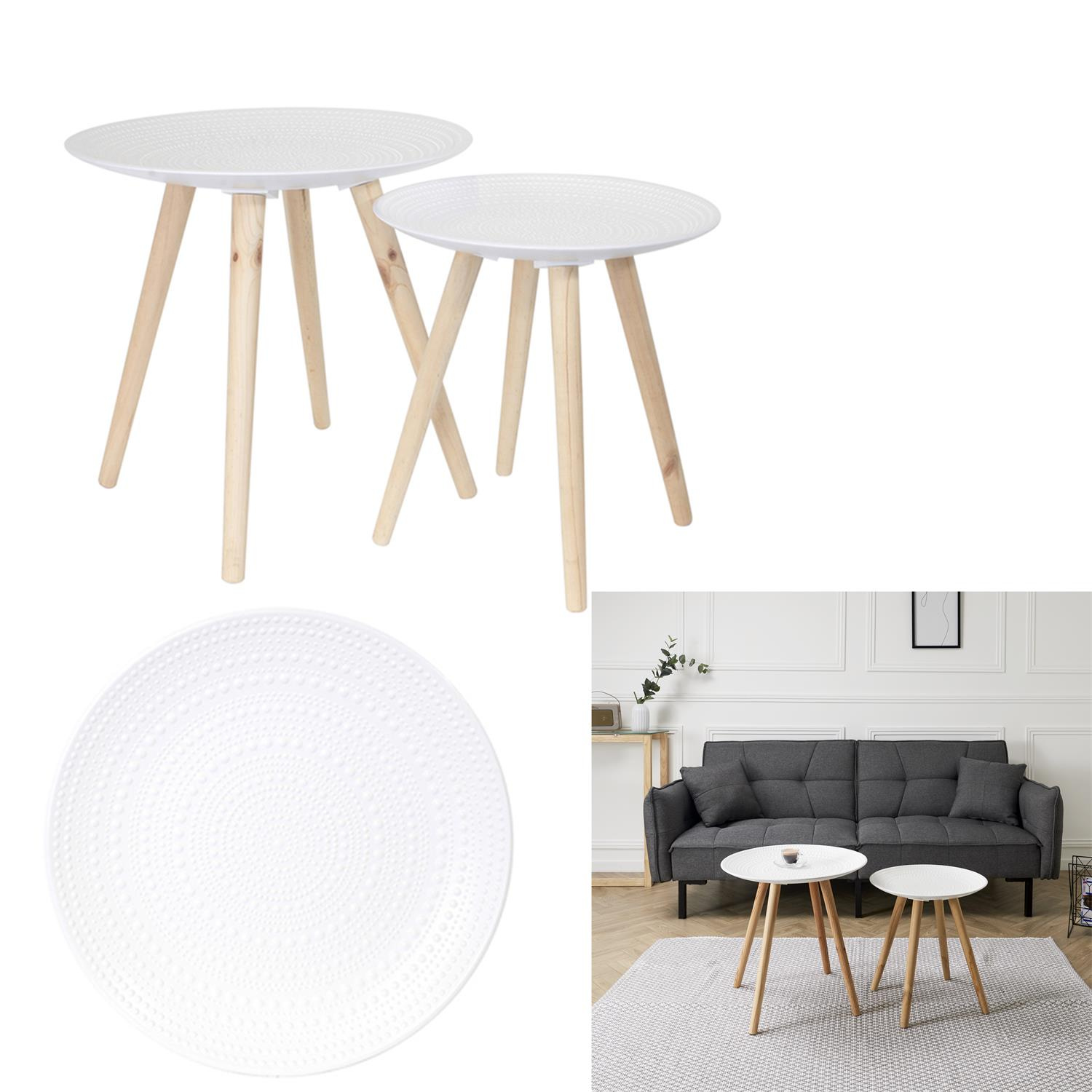 Zestaw dwóch okrągłych stolików pozwoli na aranżację salonu lub przedpokoju w stylu skandynawskim. Dwa stoliki o dwóch rozmiarach: duży wysoki: 49,5cm o średnicy 49,5cm oraz mały o wyskości 42,5cm i średnicy39,5cm.Ten zestaw stolików będzie wyglądał świetnie w Twoim salonie lub biurze! W 100% skandynawski design nada Twojemu wnętrzu odrobinę klasy! Okrągłe blaty z płyty MDF i nogi wykonane są z surowego drewna. Wymagają łatwego montażu. Max. obciążenie 10kg na stolik.