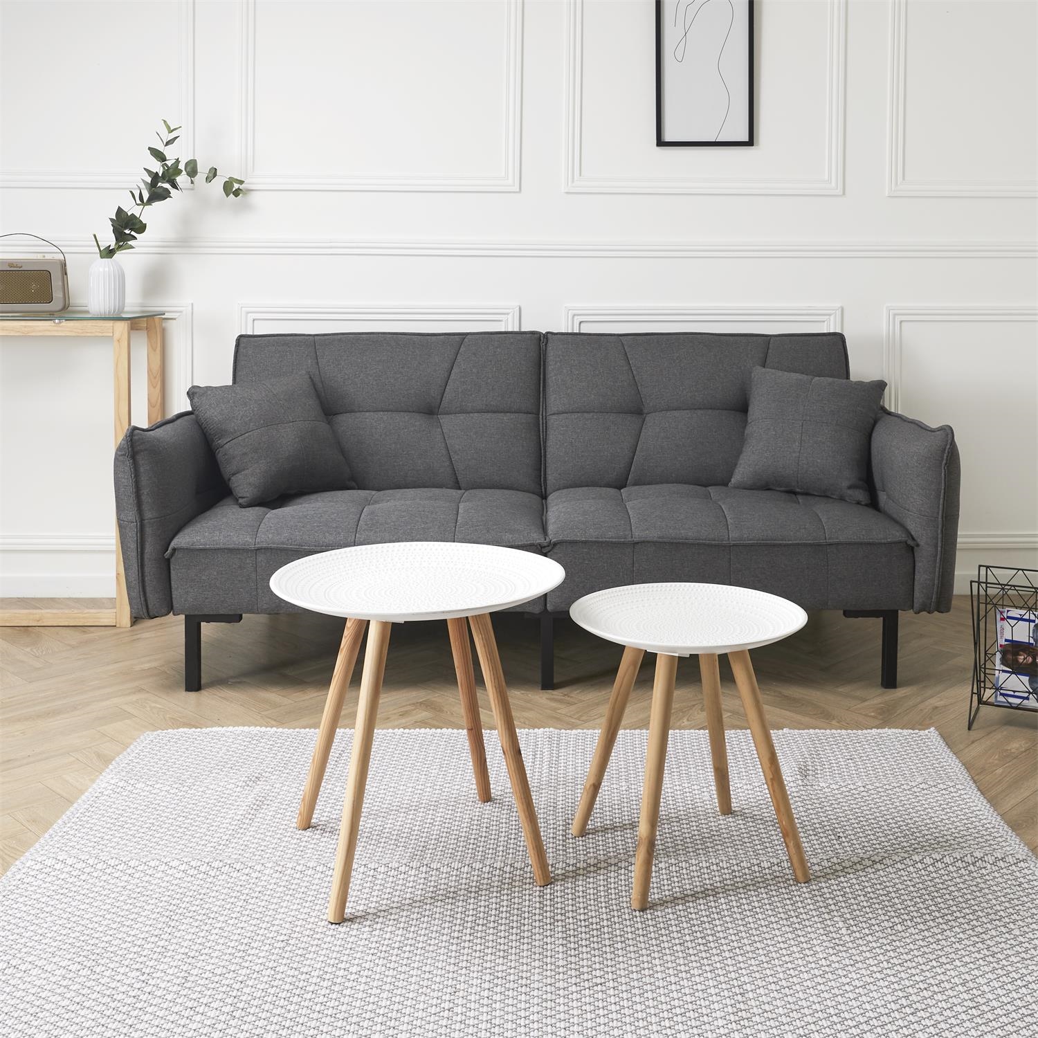 Zestaw dwóch okrągłych stolików pozwoli na aranżację salonu lub przedpokoju w stylu skandynawskim. Dwa stoliki o dwóch rozmiarach: duży wysoki: 49,5cm o średnicy 49,5cm oraz mały o wyskości 42,5cm i średnicy39,5cm.Ten zestaw stolików będzie wyglądał świetnie w Twoim salonie lub biurze! W 100% skandynawski design nada Twojemu wnętrzu odrobinę klasy! Okrągłe blaty z płyty MDF i nogi wykonane są z surowego drewna. Wymagają łatwego montażu. Max. obciążenie 10kg na stolik.