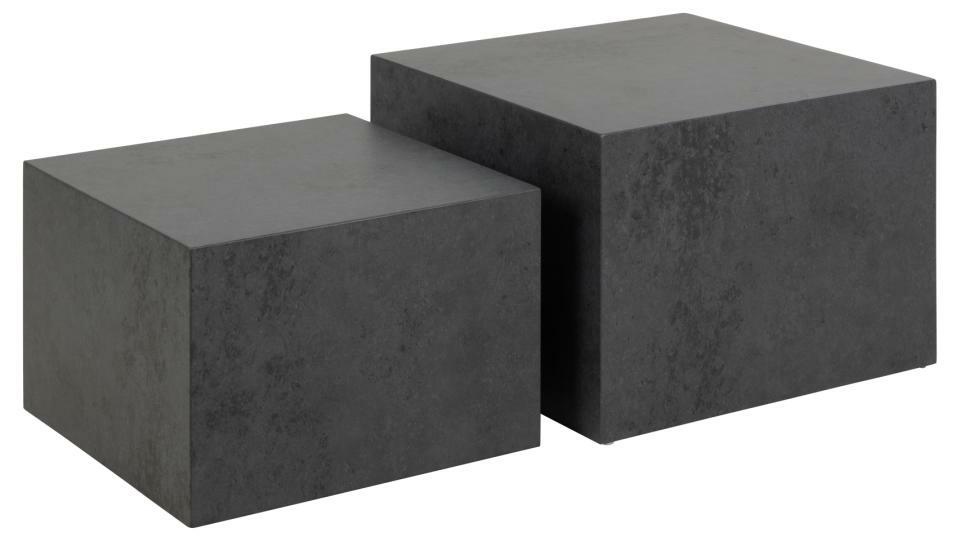 Komplet dwóch stolików w formie sześcianów (58x58x40;50x50x33). Pokryte są laminatem o wzorze czarnego kamienia. Stoliki będą świetnie wyglądać w eleganckim salonie. Mogą również pełnić funkcję kwietników. Od spodu posiadają niewielkie plastikowe nóżki zabezpieczające podłogę przed niszczeniem. Ilość kartonów: 1 Wymiary kartonów: 65x46x65cm Waga kartonów: 23,5kg