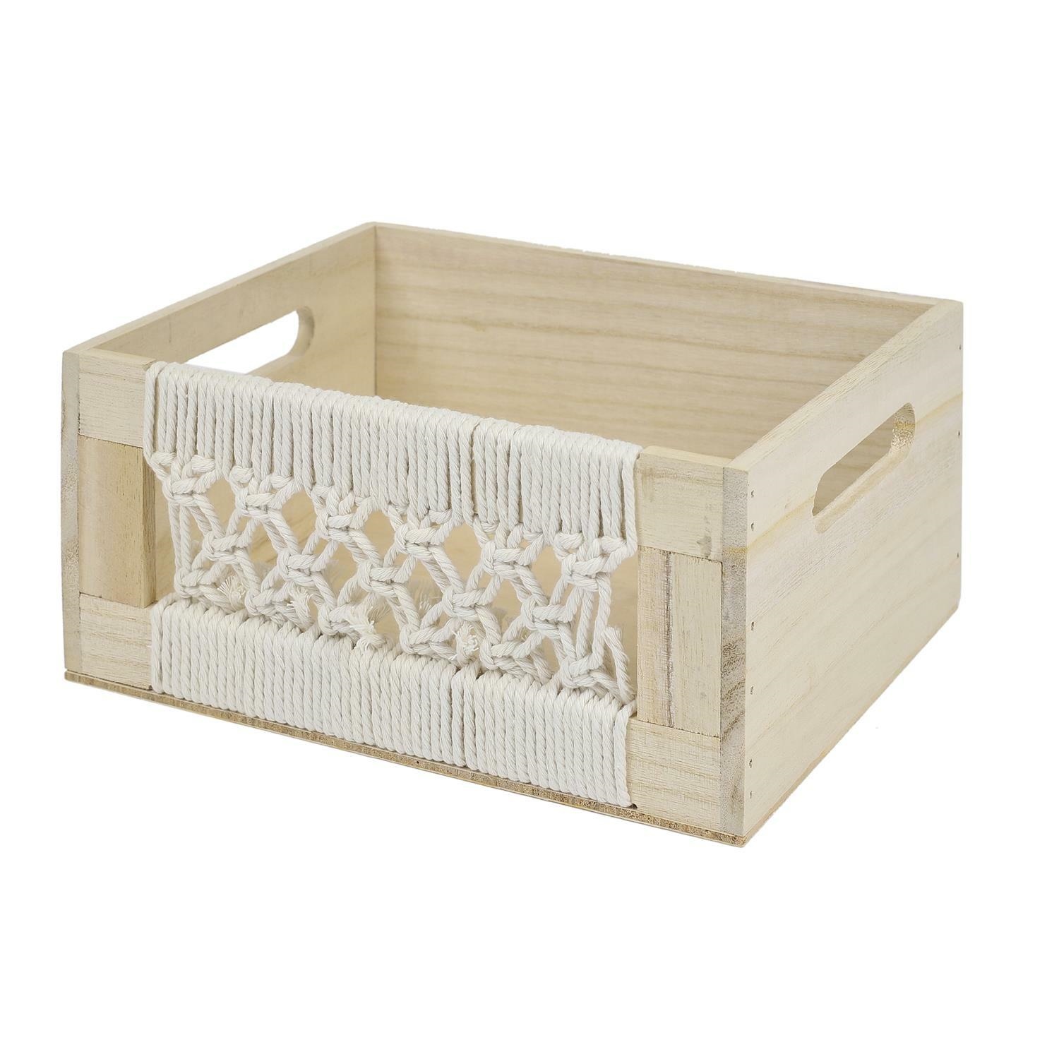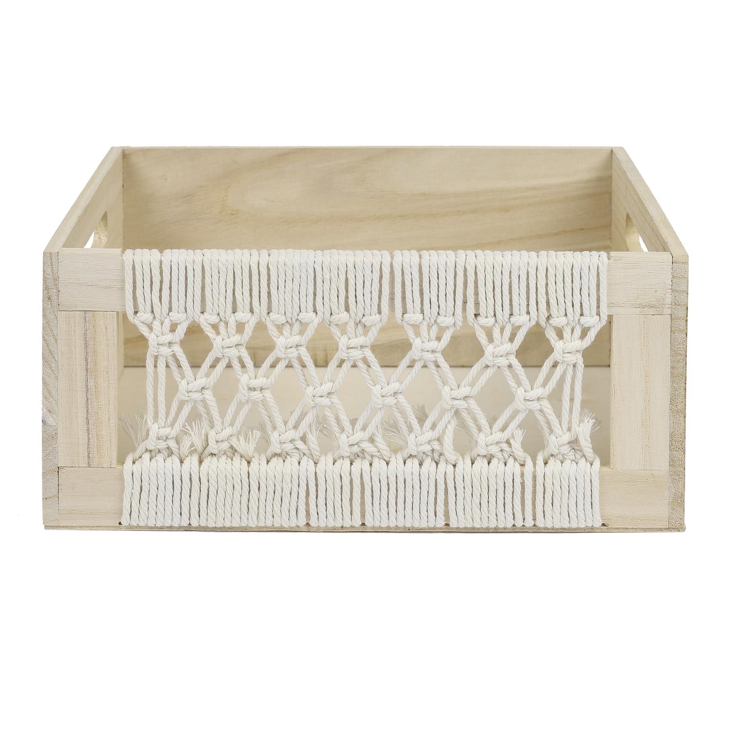 Zestaw 3 pudełek w stylu boho to ciekawe polączenie drewna oraz plecionki. Jeden bok kżdego z pudełek wykonany został z plecionego sznurka, który dodaje stylowego wyglądu. Materiał; drewno paulownia oraz bawełniany sznurek. Wymiary pudełek: duże: 35 x 25,5 x 15 cm średnie: 30 x 23,5 x 12 cm małe: 25,5 x 20 x 11 cm Pudełka sztaplują się.